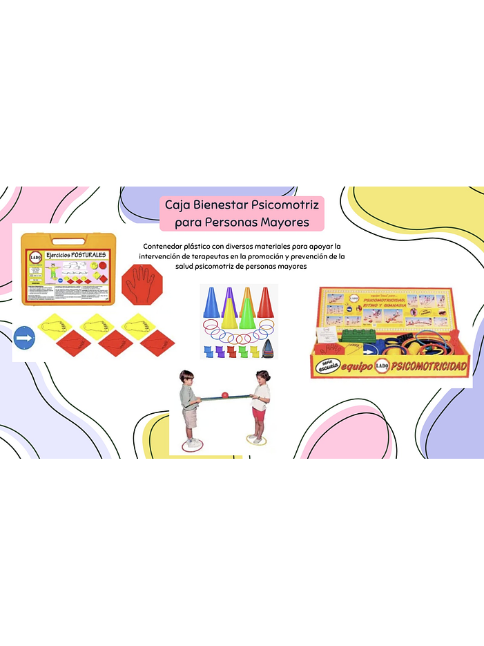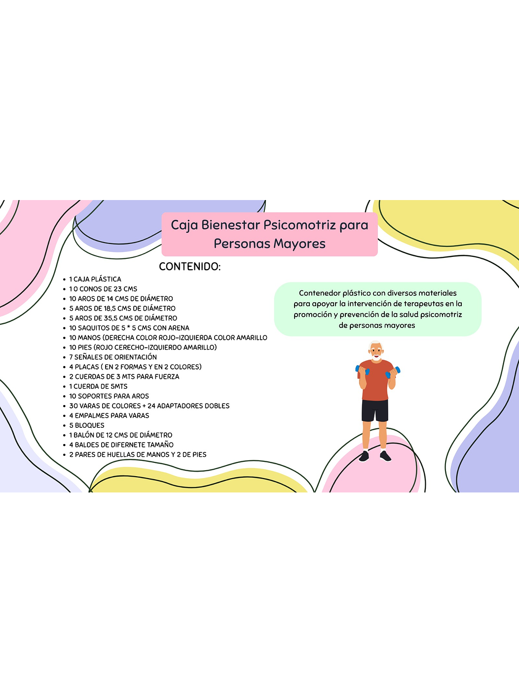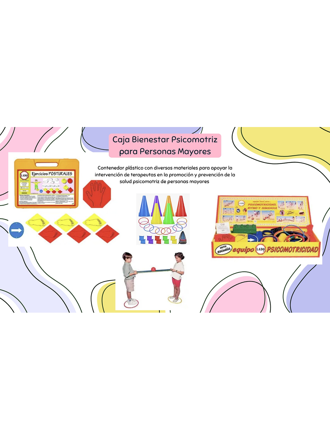Contenedor plástico con diversos materiales para apoyar la intervención de terapeutas en la promoción y prevención de la salud psicomotriz de personas mayores.