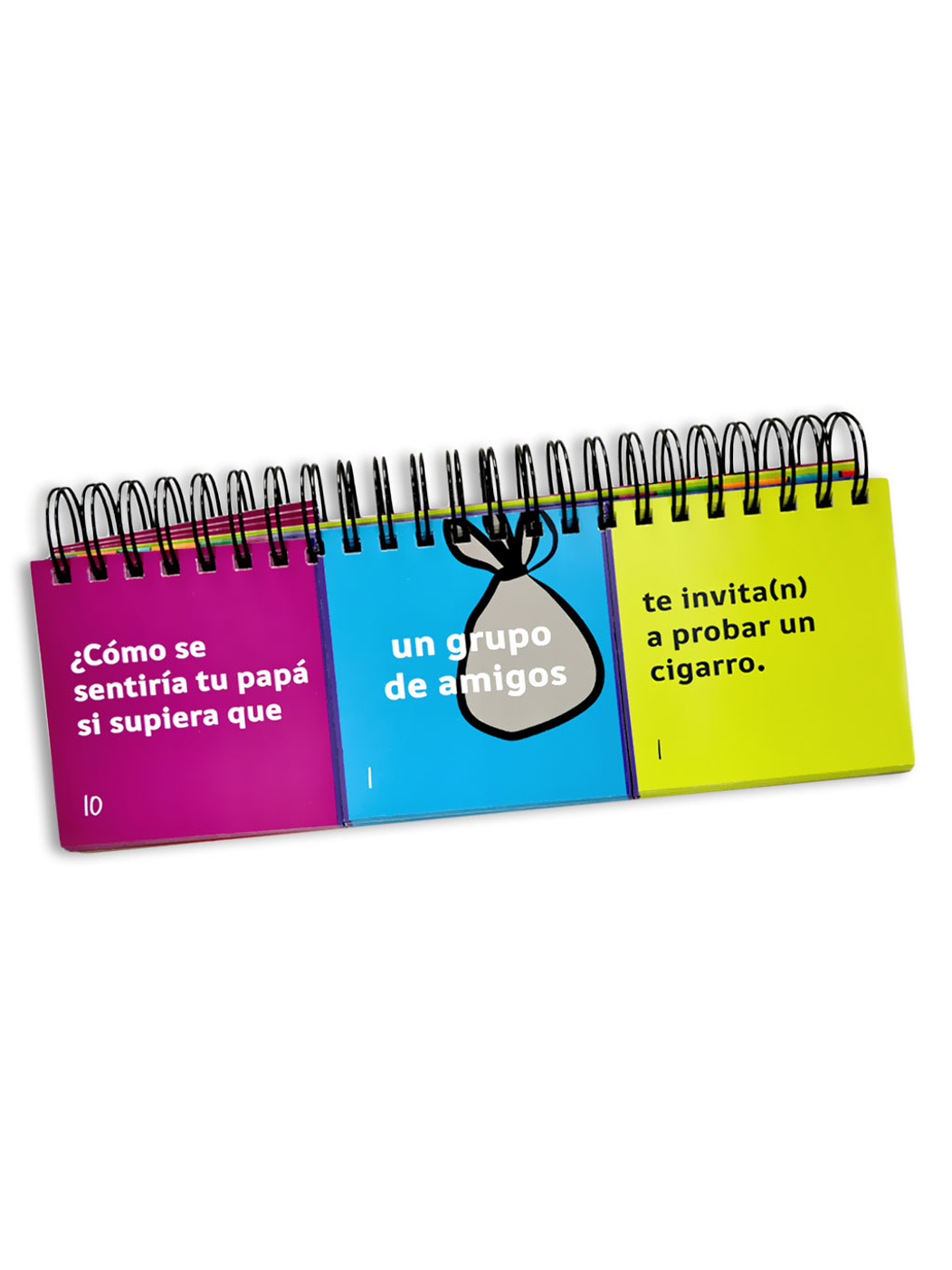 El cuadernillo incluye 4 categorías de actividades: Enfrentando Situaciones, ¿Cuánto sabes?, Viviendo Mejor y Conversemos. Mediante la formación de frases, los participantes pueden compartir experiencias, debatir y analizar información, generando más de 7.000 combinaciones posibles.