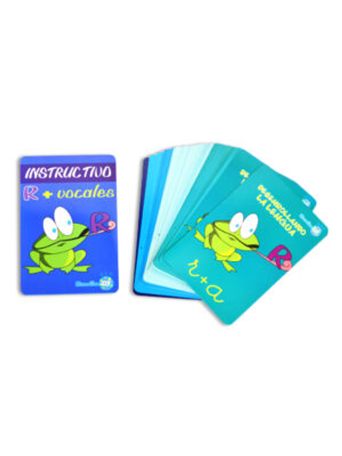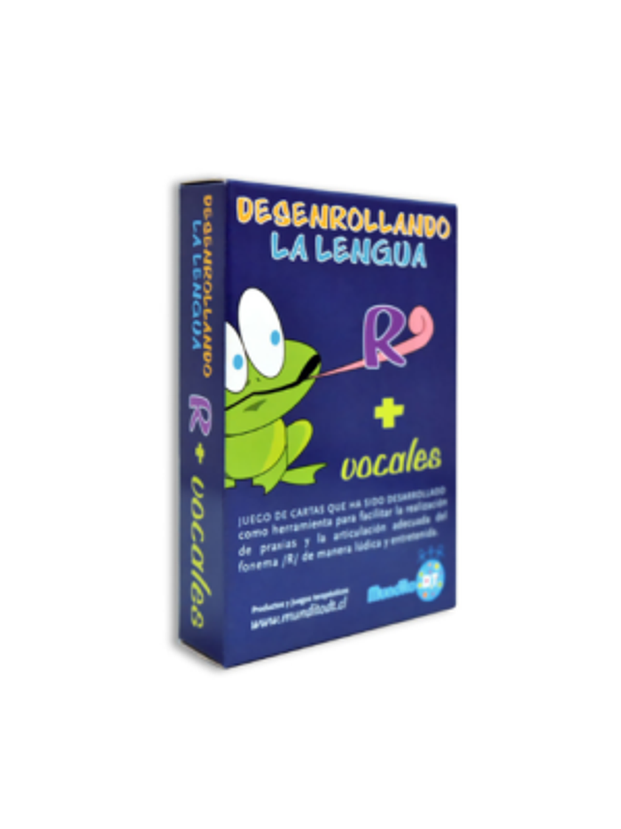 Juego de cartas desarrollado para facilitar la realización de praxias y articulación adecuada del fonema “R” de manera lúdica y entretenida. A través del juego, el adulto podrá facilitar el aprendizaje fonoaudiológico y a su vez se estará desarrollando el vocabulario, la comunicación y la expresión del niño. El juego contiene 60 cartas, 30 contienen la letra “R” y las vocales fuertes, 10 trabajan la letra R al inicio, otras 10 trabajan con doble “R” y finalmente, 10 cartas de completación de palabras.